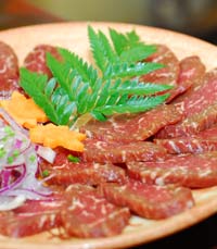המגש הבא כבר זימן לנו את חיות המשק עבות הבשר: נתחי בקר בחיתוך יפני מסורתי (שבאופן גס הקבילו לשורט ריב ופילה) ופילה חזיר. את הנתחים מהמגש הזה צלינו אחד-אחד, כדי להתענג עליהם לאט, ובין נתח אחד לרעהו התענגנו גם על הטקי קומי – קדירת אבן לוהטת, שהאורז המוגש בה דורש ערבוב מדי פעם, כדי שלא יידבק ויישרף על דפנות הקערה. האמת היא שטעמו של האורז משתבח ככל שהוא "נשרף".