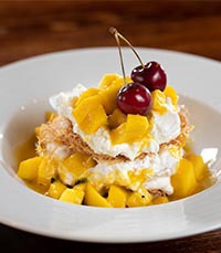 קובה נייה, מנה של טרטר מפילה בקר עם צנוברים ובצל עם חצילים כבושים, מלפפון בלאדי ולחם בסטייל לבנוני וקרפצ’יו מדג ים טרי שחתוך דק ומוגש עם זרעי עגבניות, פירורי גבינת לבנה, שקדים, טוביקו, פרי מרענן ולחמניית בריוש קלויה.